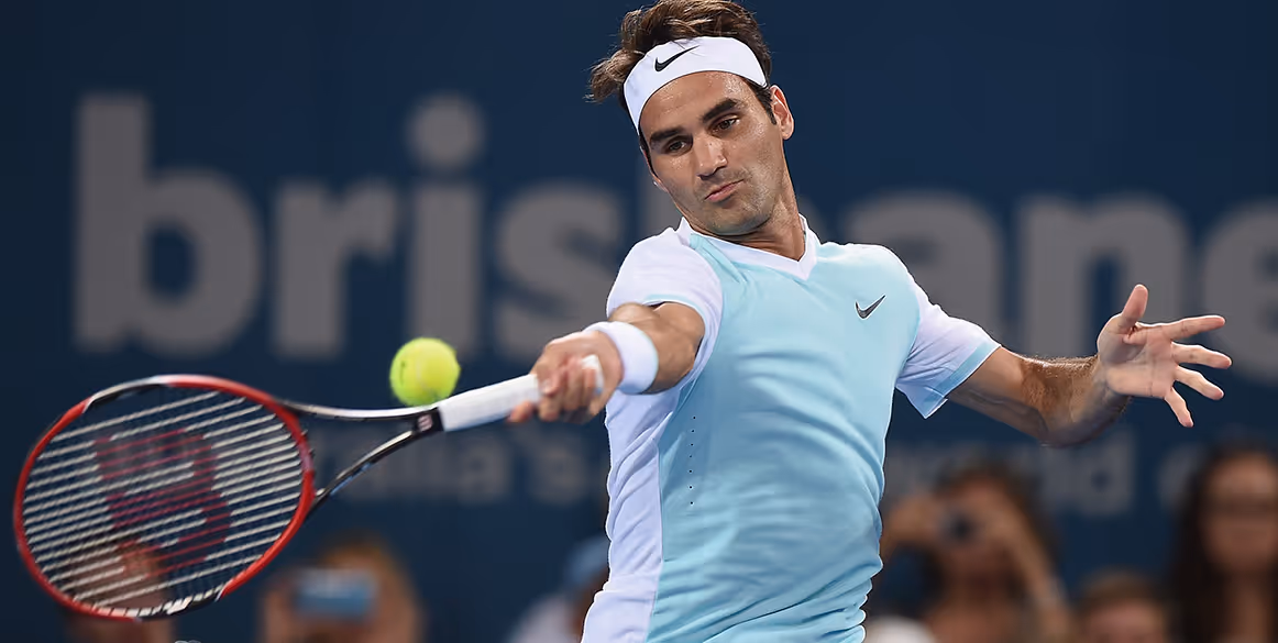 Op de onderstaande foto zie je hoe Roger Federer zijn lichaamsgewicht goed gebruikt. Nadat hij de bal raakt, zie je zijn achterste voet van de grond komen en zijn lichaam voorwaarts bewegen. op de foto zijn tip 1 en 2 ook duidelijk te zien, Federer heeft hier zijn forehand op tijd voorbereid en zijn non-slagarm wijst naar de zijkant.