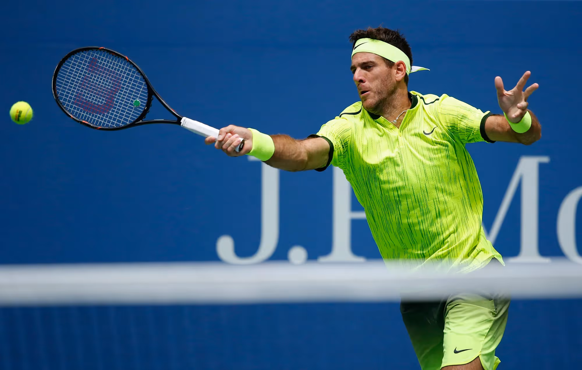 Op de onderstaande foto zie je hoe Del Potro zijn arm ver naar voren uitstrekt na het raken van de bal.